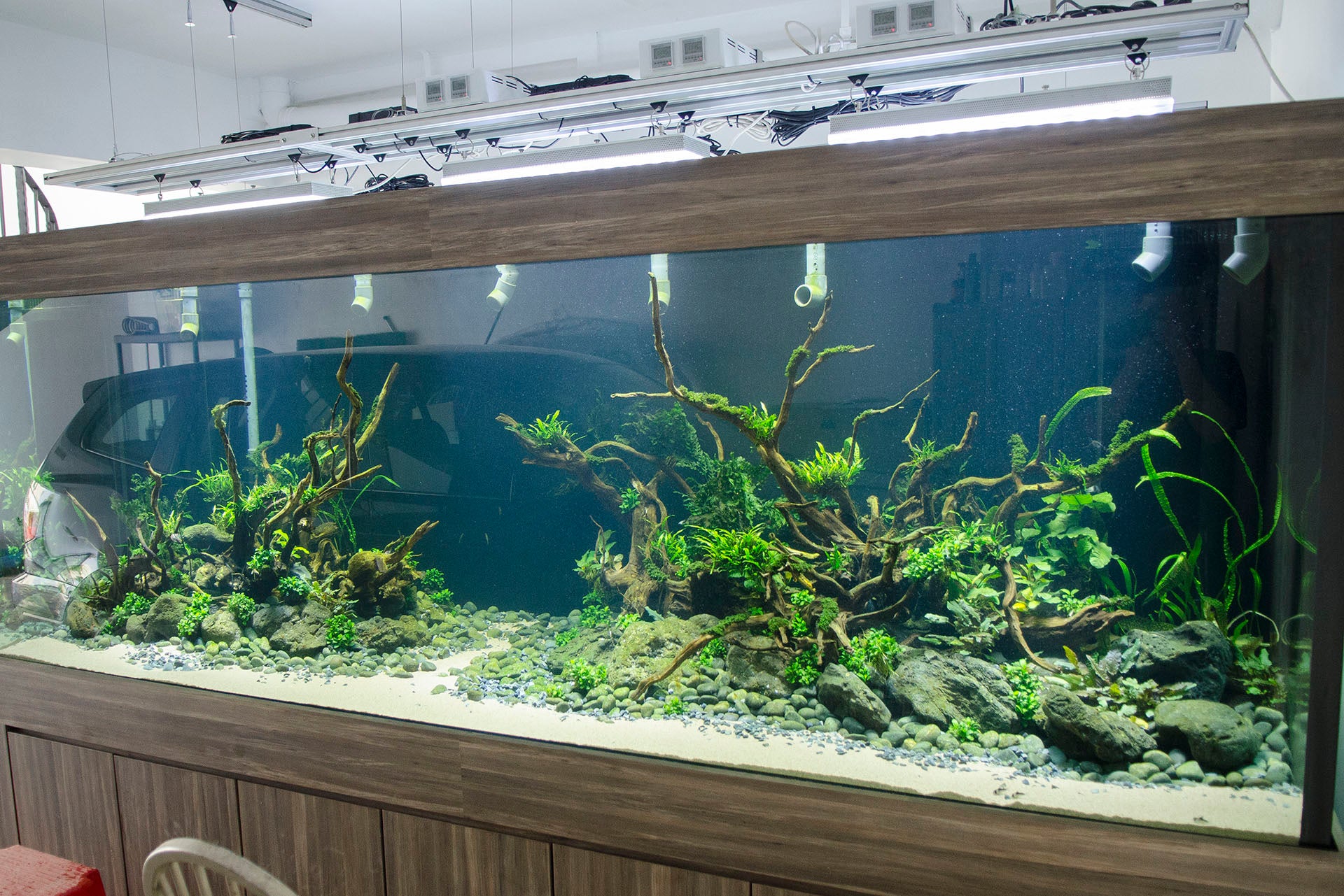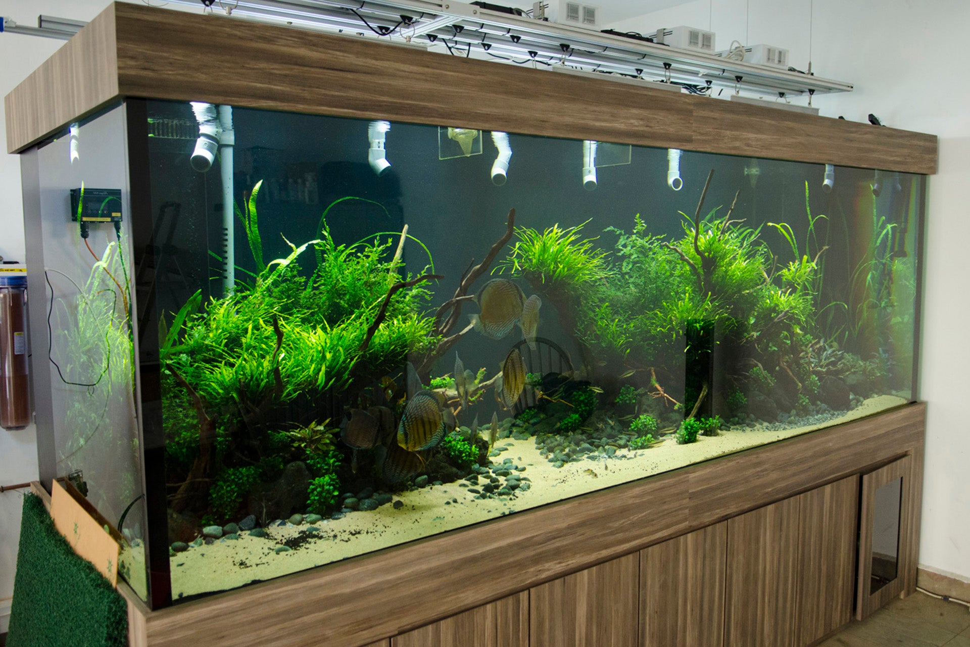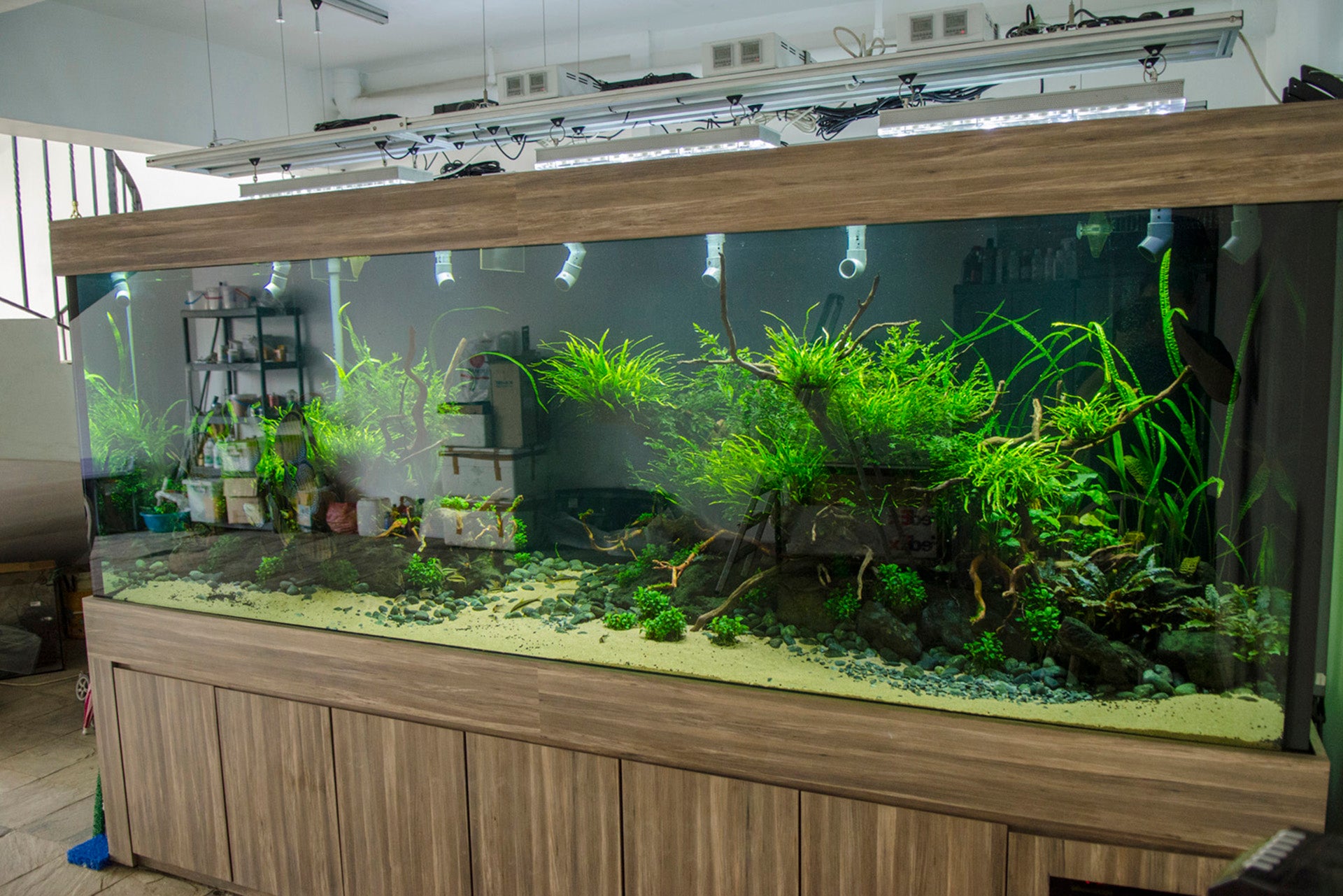 A 3x1x1m Planted tank filled with hardscapes, ferns, anubias, cryptocoryne, tetras and discuses!