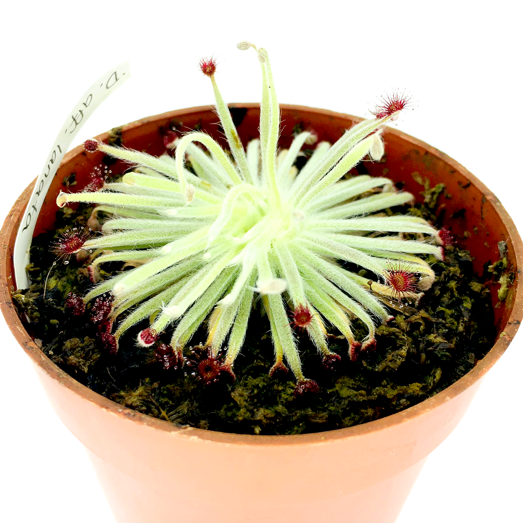 Drosera aff. lantata is part of the Petiolaris Complex. These particular plants were originally collected around Flying Fox Creek in the Northern Territory of Australia. The leaves turn deep red in intense light and the petioles (stems) are covered in numerous white hairs that give the plant a silvery sheen.