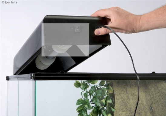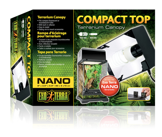 The Exo Terra Compact Top Canopy is a compact fluorescent terrarium canopy designed for use with the Exo Terra Glass Terrarium. This easy-to-install canopy accommodates compact fluorescent bulbs or low wattage incandescent bulbs. A combination of different Exo Terra Repti Glo compact fluorescent bulbs can be used (PT2226 / PT2227 / PT2228) to create the ideal ultraviolet/visual light ratio or a combination with an incandescent light source such as the Exo Terra Sun Glo to increase the ambient air temperature. Optional accessories such as the Exo Terra Digital Thermometer and Hygrometer and the Exo Terra Thermostat and Hygrostat can be slid into the special sliding rim on the top of the canopy.