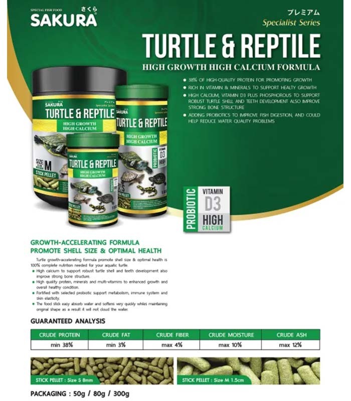 Turtles need both protein and calcium minerals to stay healthy and develop strong shell. Sakura Specialist Series food is an optimal blend and source of crude protein, fat, fiber, moisture and ash to meet the dietary needs of turtles.