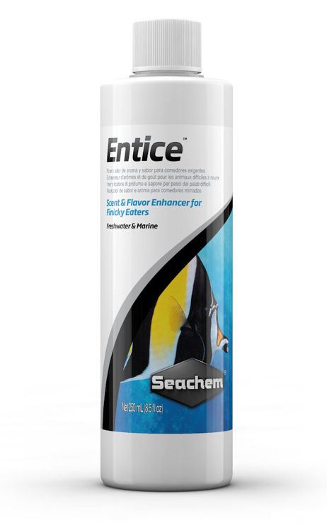 Entice™ is an all natural scent and flavor enhancer for finicky eaters. Simply mix Entice™ with any food item, such as Seachem’s NutriDiet® Flakes, to attract the interest of finicky eaters. Ideal for all marine and freshwater fish