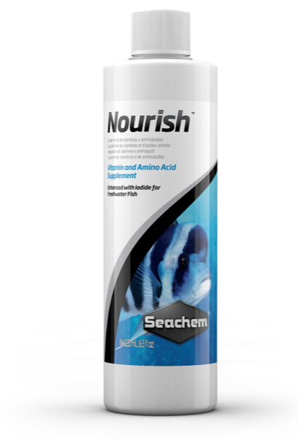 Nourish™ is a comprehensive vitamin, amino acid, and trace element supplement developed to address nutritional requirements commonly associated with long term closed system housing of freshwater ornamental fish. Nourish™ contains potassium iodide in a heavy base of spirulina and chlorella. The nutrient iodine is essential for the biosynthesis of the thyroid hormones thyroxine and triiodothyronine.* Both spirulina and chlorella contain a rich assortment of amino acids and vitamins. Nourish™ can be used on marine ornamental fish; however, it is specifically designed for freshwater fish.