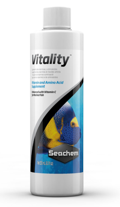 Vitality™ is a comprehensive vitamin, amino acid, and trace element supplement developed to address nutritional requirements commonly associated with long term closed system housing of marine ornamental fish. Vitality™ contains ascorbic acid in a heavy base of spirulina and chlorella. Ascorbic acid is a cofactor in the hydroxylation of proline and lysine to components of procollagen, the precursor of collagen, necessary for the formation of connective tissues, scar tissue in wound repair, and bone matrix.* Both spirulina and chlorella contain a rich assortment of amino acids and vitamins. Vitality™ can be used on freshwater ornamental fish; however, it is specifically designed for marine fish.