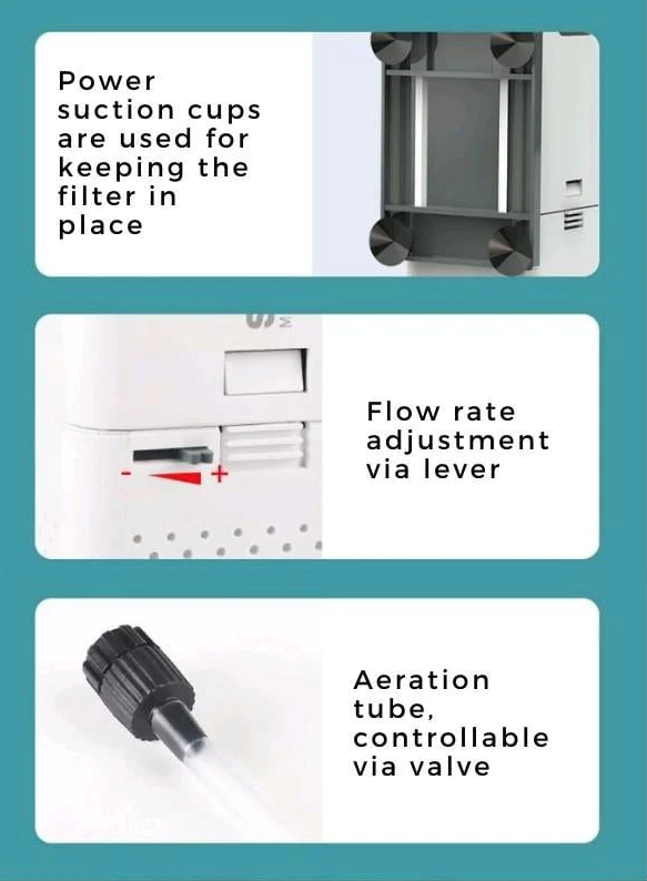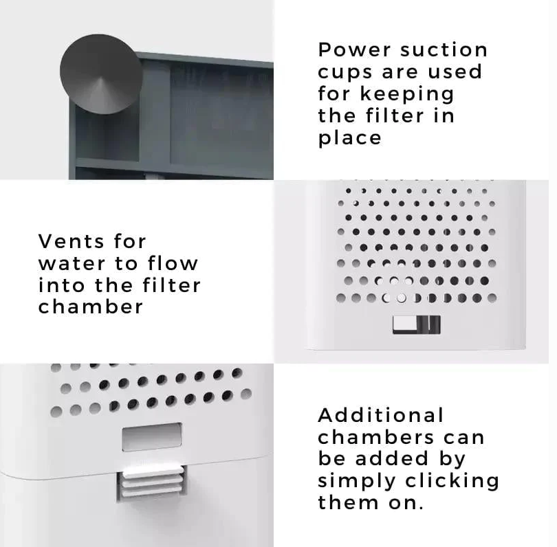 Power suction cups are used for keeping the filter in place.